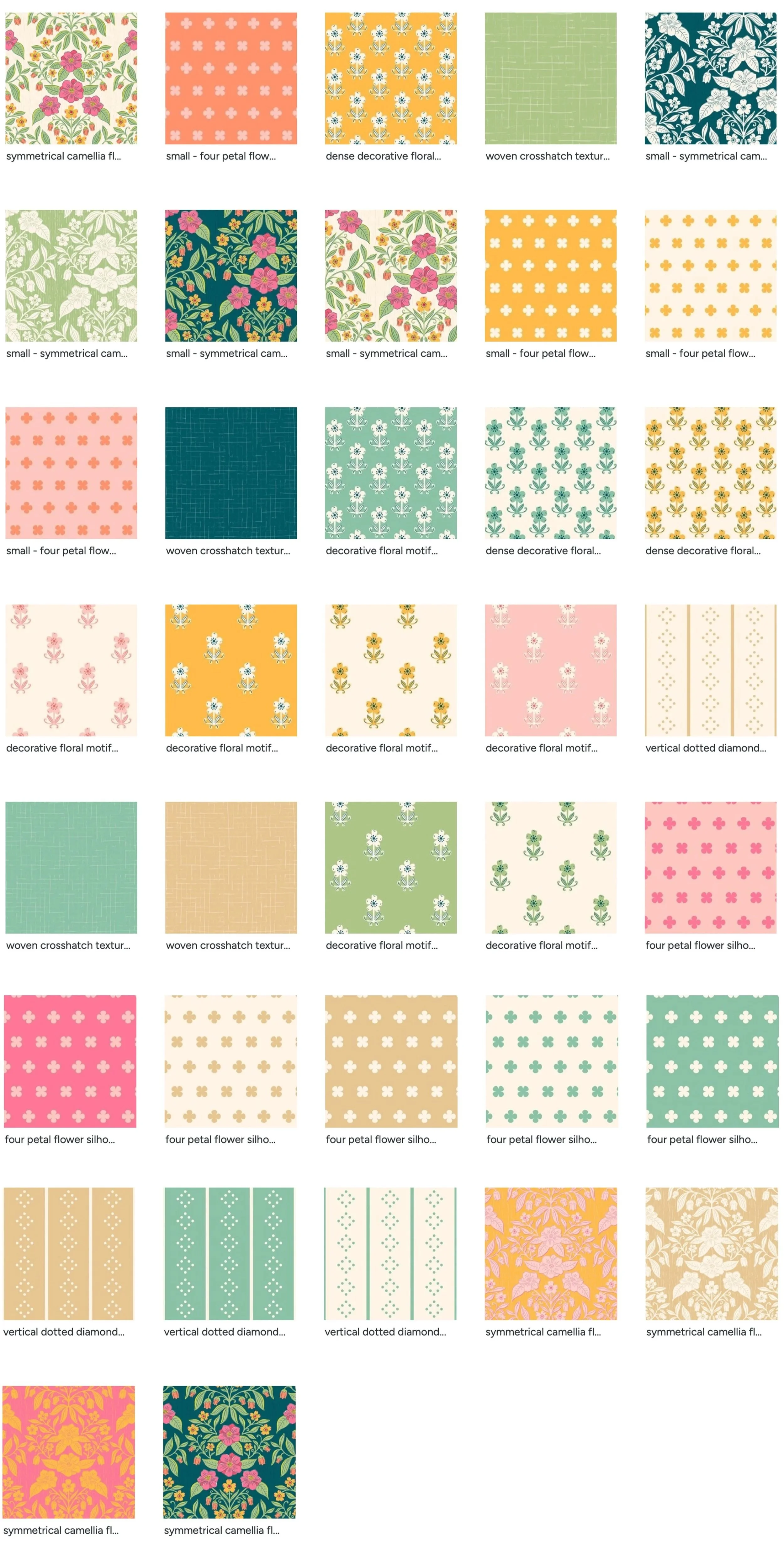 Crafted Camellias is a surface pattern collection created as my response to Spoonflower’s Craft Maximalism challenge. It blends traditional craft influences with bold, joyful color, resulting in designs that feel both grounded and optimistic.