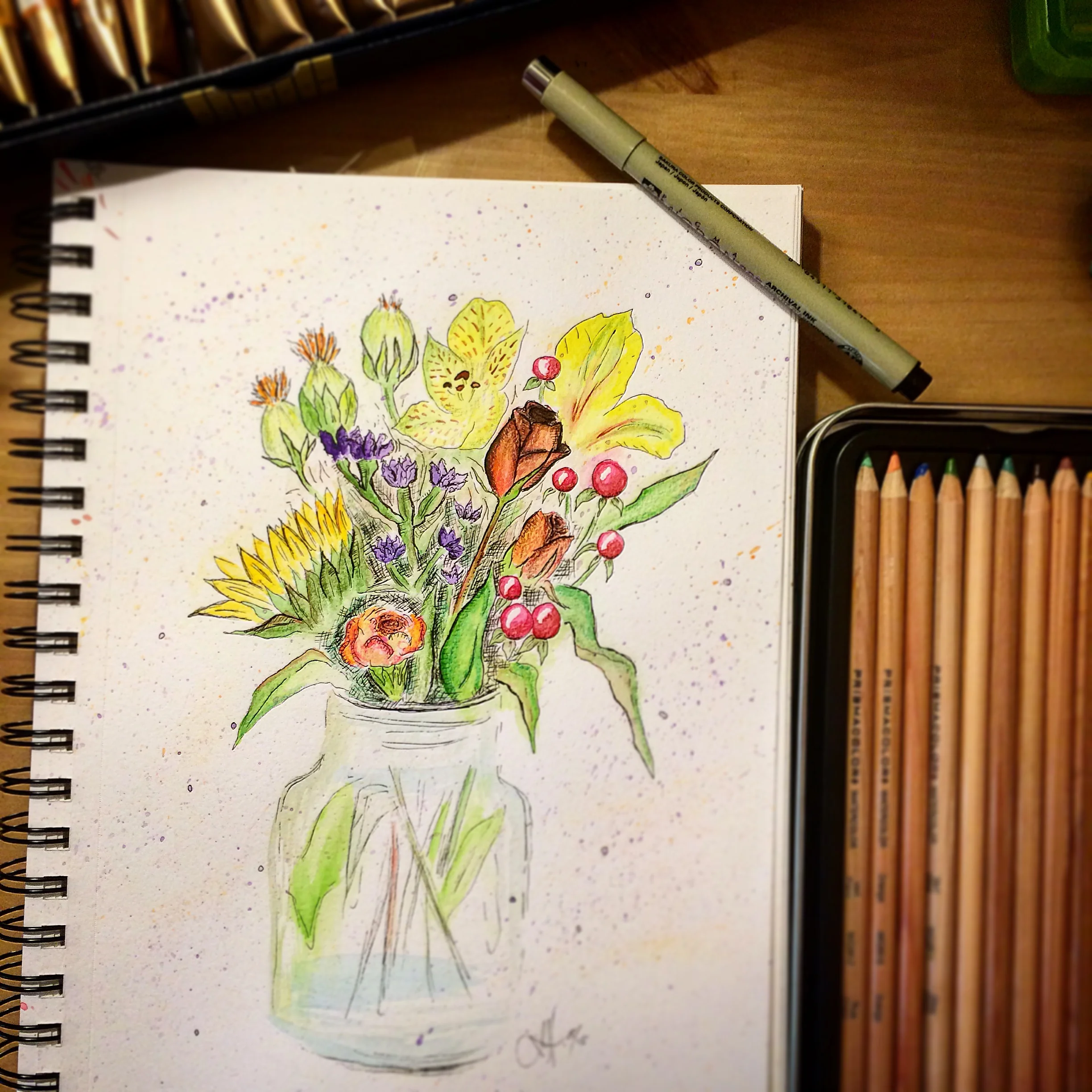 This week's bouquet (August 15). I couldn't stop myself and ended up going overboard with ink.