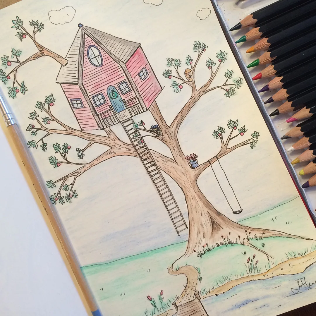 This morning I woke up early like I always do to get right to work, I feel like I'm most creative as soon as I get out of bed, before the sun comes up, but to my disappointment, there was an internet outage and the project I was hoping to work on was a website. It was cold and rainy outside. I missed out on the perfect morning to sleep in. For a minute I almost allowed myself to get upset about outside forces interfering with my productivity but then I realized this was the perfect opportunity to do something I've been trying to find the time to do all week; draw something for myself, for fun. So I drew a tree house and as I drew it, I was suddenly back in fourth grade, escaping to a fun far away place where it wasn't rainy or cold.